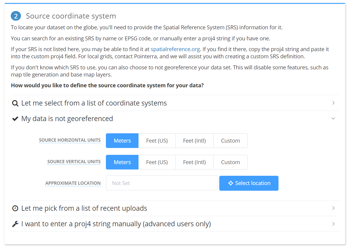 If you don't know the coordinate system used or a coordinate system is not relevant to your point cloud (ie. if its position in the world is not important), select the My data is not georeferenced option. This will allow you to set the horizontal and vertical units as well as provide an approximate location so that the point cloud can be searched for on the map (can be left blank). This will disable some features such as using base map layers with your point cloud.