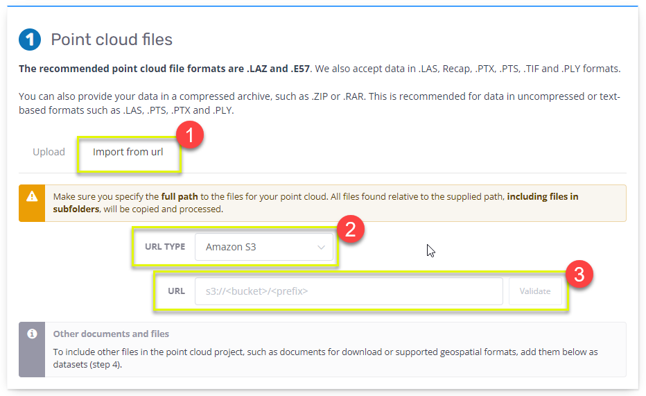 Source files can also be added through importing from a URL. To do this select the 'import from URL' tab (1), then choose the URL type (Amazon S3, Azure Blob storage, or other types such as HTTPS) (2). Finally specify the full path to the files of the desired point cloud and select the validate button to check the URL for the data. (3)