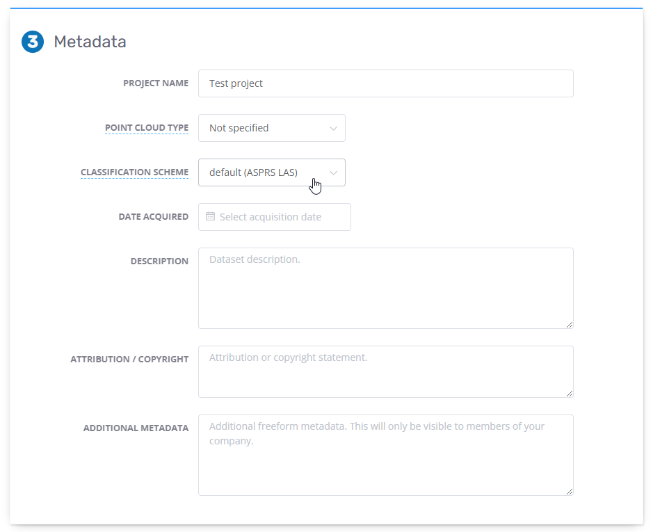 Next, you have the ability to provide metadata about the point cloud/data being uploaded such as the project name, point cloud type (capture method), classification scheme, date acquired, description and attribution/copyright information. You can also add any additional textual metadata (this will only be visible to members of your company and not external viewers when using share links, or if you make the dataset public) using the Additional Metadata field. This metadata can also be modified after the build process has finished, see Editing point cloud metadata for more information.