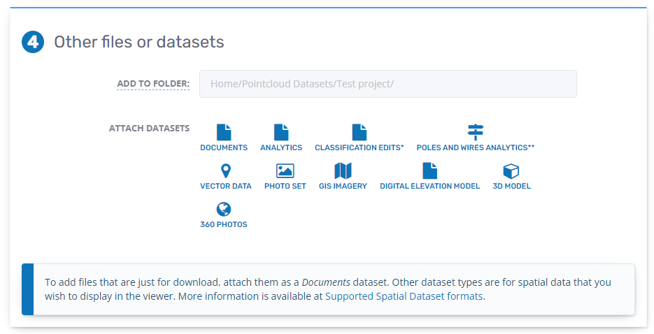 Next, you can upload any datasets that you want to be associated with this point cloud. This is additional non-point cloud data that provides information about or enhances your point cloud. Examples include providing downloadable documents or 3D models that can be viewed alongside your point cloud. You can add these datasets into a folder to help keep them organised. You can also add, change or remove associated datasets after the point cloud has finished building, see Attaching documents for more information.