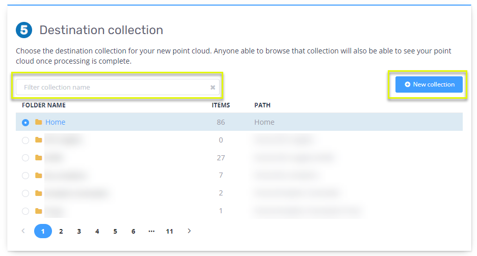 Now, you can assign your point cloud to an established or new destination collection (1), where it will be stored. You can search/filter for a specific collection using the search bar (2). Collections provide a way to organise your point cloud data, and manage permissions for your users and teams (note: the collections used for organising point clouds are separate from the folders used to organise datasets). See Using Collections for more information.