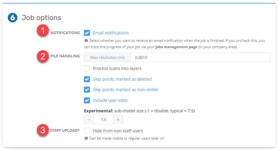 Here you can select preferences with how the Job is handled. You can enable receive a notification when the job is finished (1). If you don't want to receive notifications, the job's status and information can be found on your company page under the Jobs tab. Then you can adjust how the files are handled in terms of the max resolution its processed at as well as dealing points that have been deleted, non-visible or edited (2). Finally, you can also select whether this upload is made visible to non-staff users, however this preference can be changed after the upload is completed (3). See Finding Company Page for more information.