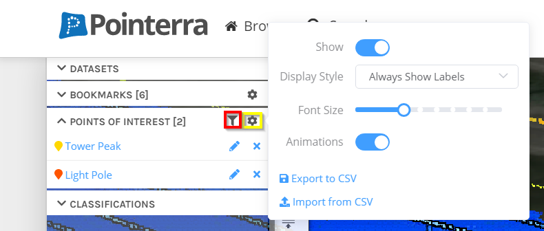 To adjust the properties of POIs, select the gear icon next to the Points of Interest tab. This allows you to hide POIs, change the font size and import and export POIs to a csv file.