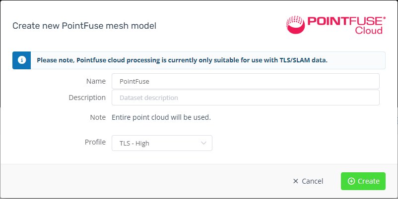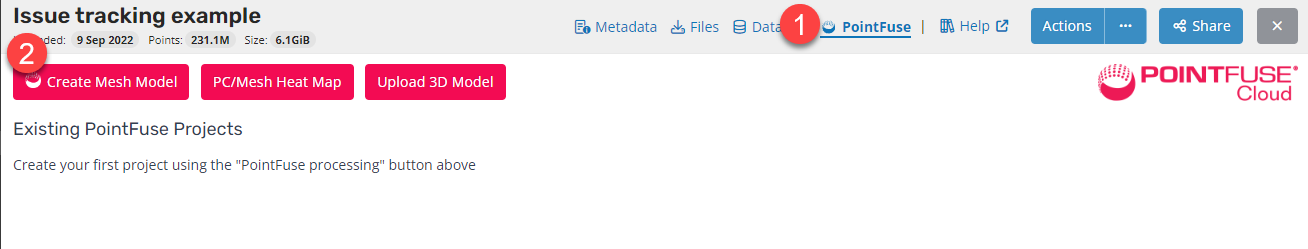 - This will trigger a processing job to create a mesh of the point cloud into a new PointFuse project.