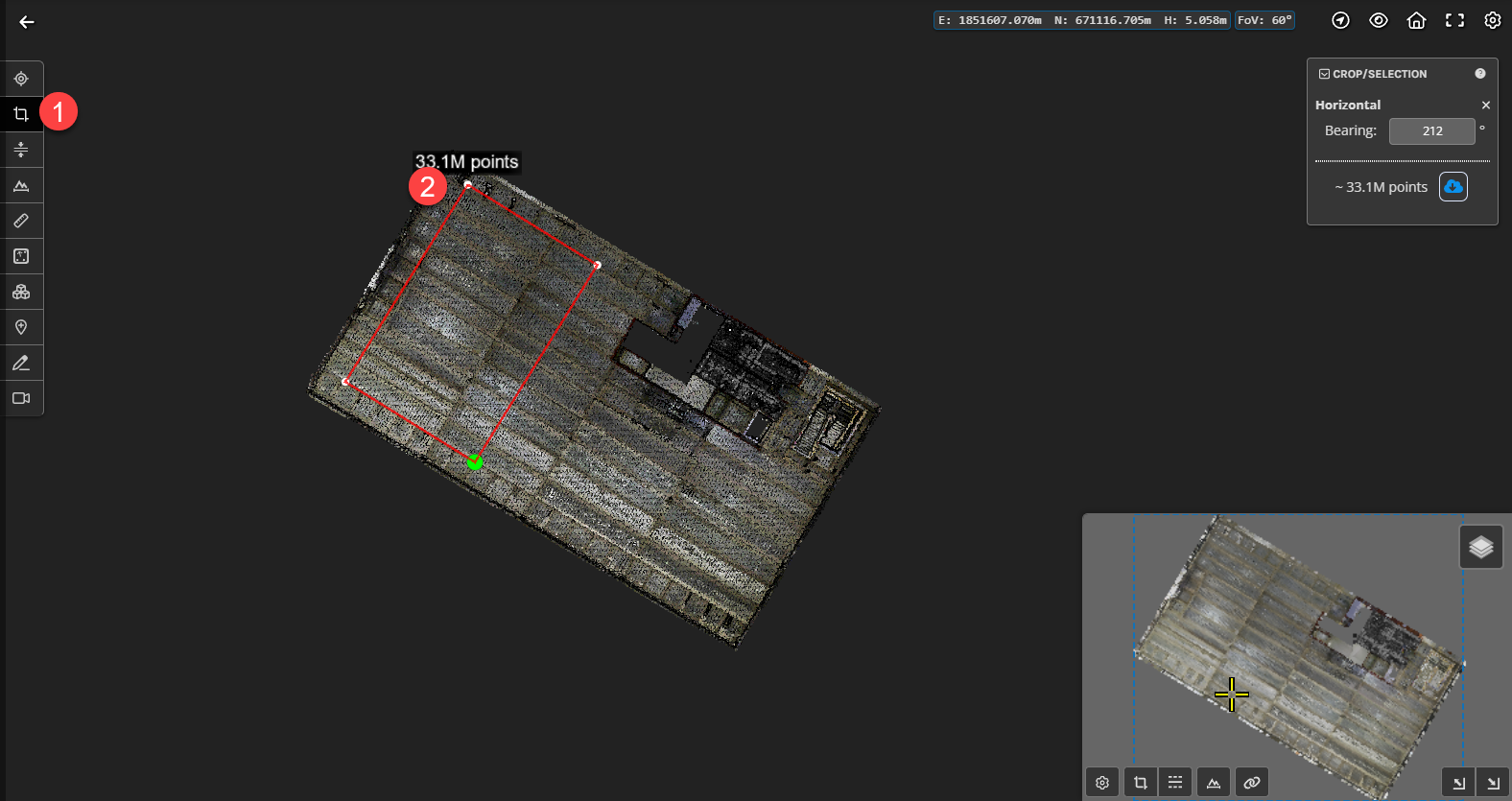 - If a mesh is to be generated from a subset of the point cloud use the 'Rectangle Clip' tool first.