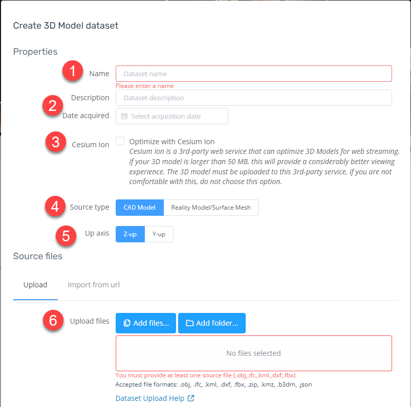 - Toggle on Cesium Ion (for any models greater than 50mb - optimizes the model for web streaming). Leave off if the model format is Cesium 3D tiles.